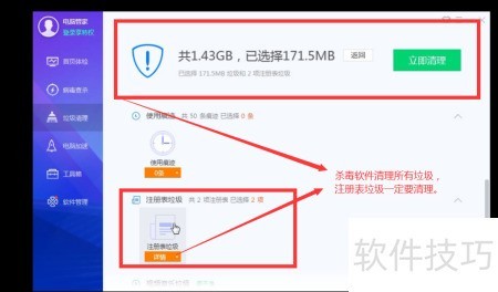 9、 开启杀毒软件,彻底清理电脑和注册表中的垃圾文件。