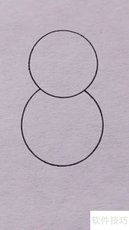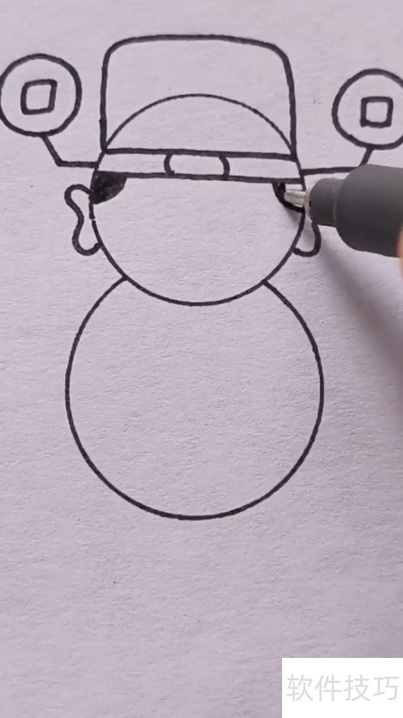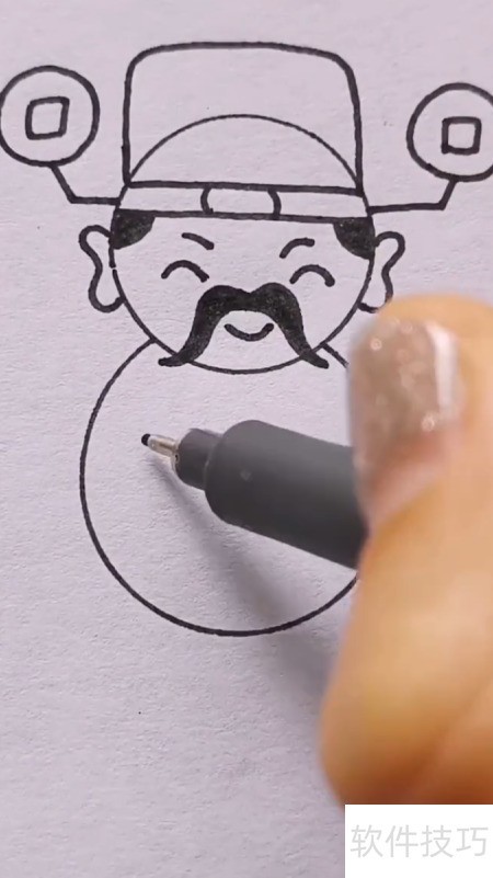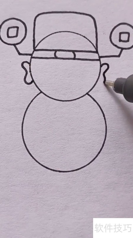 1、 先画两个相连的圆圈,分别代表财神的头部与身体轮廓。
