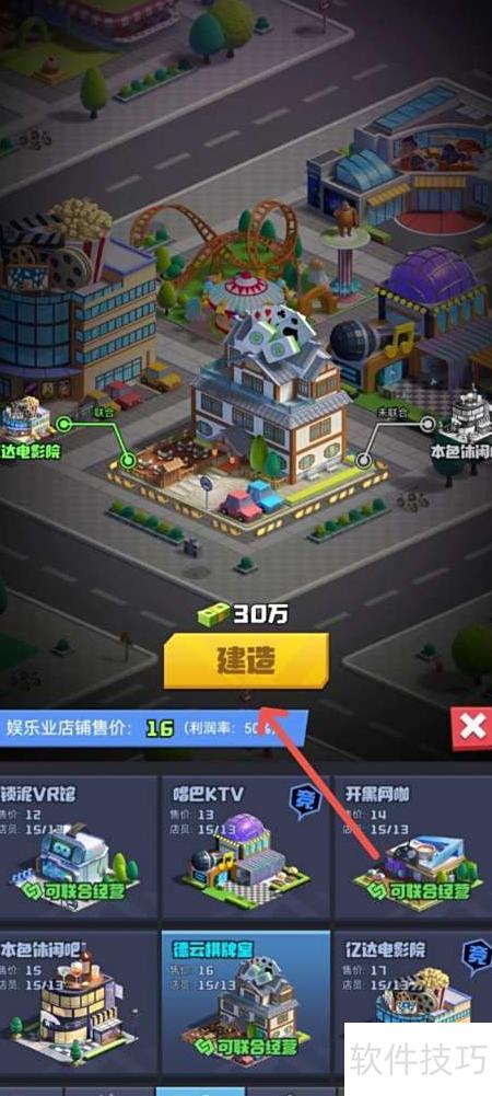 2、 进入店铺建造界面,选择娱乐类建筑,点击棋牌室信息后进行建造操作。