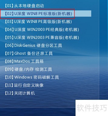 1、 将U盘制作为U深度启动盘后,重启电脑,在开机画面出现时按下快捷键进入启动菜单,选择U盘为启动设备,进入U深度主界面。在菜单中找到U深度WIN8 PE标准版(新机器)选项,按回车键确认执行,即可进入PE系统界面,具体操作所示。