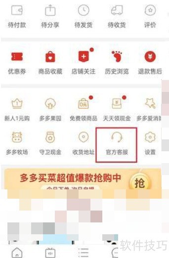 1、 打开拼多多App,进入个人中心,下滑找到并点击官方客服即可。