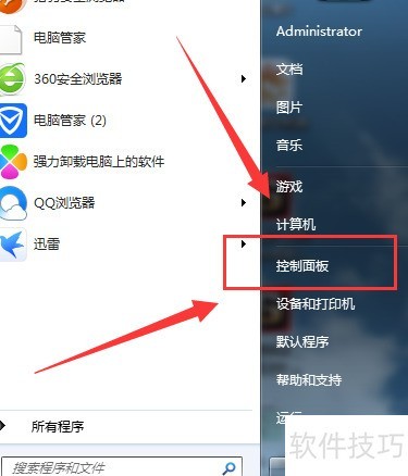 1、 点击电脑开始菜单,找到并打开控制面板选项,操作所示。