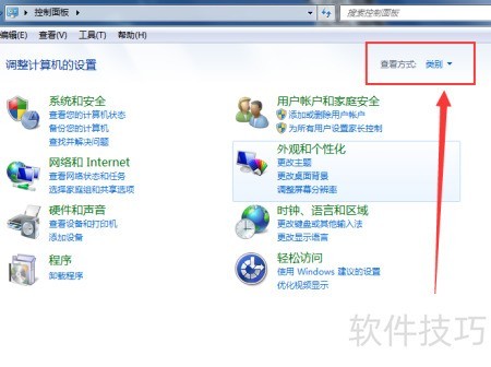 2、 进入控制面板后,界面通常所示,接着点击右上角的类别选项即可。