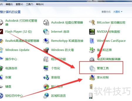 4、 选择大图标后,在下方菜单中找到管理工具,所示。