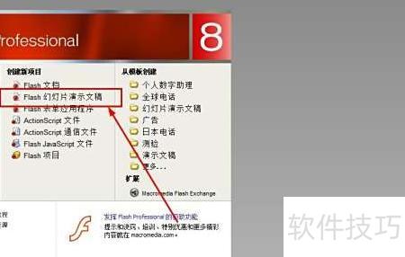 1、 介绍在Flash8中制作演示文稿的操作步骤:启动软件后,新建一个幻灯片演示文档即可开始编辑内容。