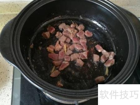 9、 将牛霖粒翻炒后加水与白糖,小火慢炖十分钟,收汁后淋于牛霖粒上即成。