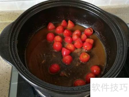 8、 放入圣女果翻炒出汁,加适量白糖,转中火熬至酸甜味浓稠即可。