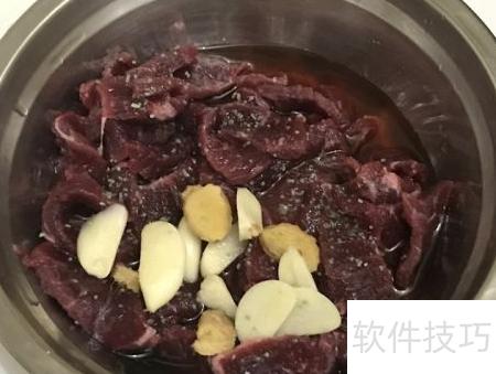 3、 将切好的牛肉放入碗中,加入蒜末、姜片和牛霖一同搅拌均匀,适量加盐调味,使调料充分渗入肉中,让牛肉更入味,这样处理后的牛霖风味更佳,口感更鲜美。