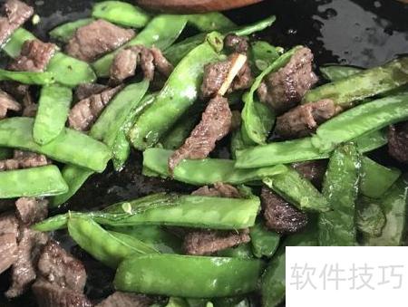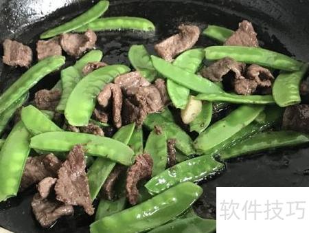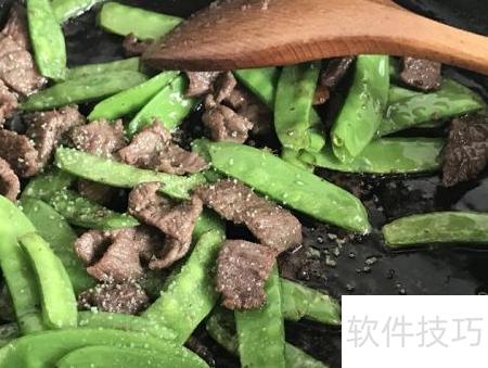 10、 将牛肉与荷兰豆倒入锅中翻炒,需不断搅动,使其受热均匀,相互入味,香气交融,口感更佳。