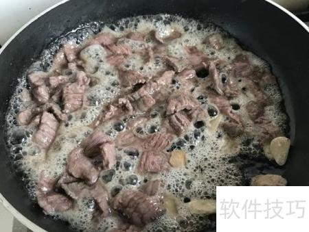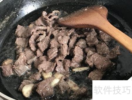 7、 高温热油下牛霖快炒,用勺翻动使其均匀受热,可提升口感,让牛肉更香嫩美味。