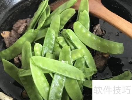 9、 将荷兰豆倒入锅中,与快炒好的牛霖一同翻炒片刻,使两者充分混合。用铲子不断搅动,确保食材均匀受热,味道相互渗透,口感更佳,整体风味更加协调浓郁。