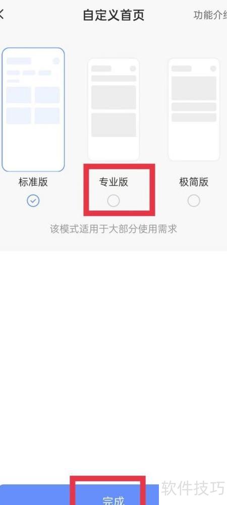 8、 点击当前页面的专业版选项,再点完成即可切换首页为专业布局。