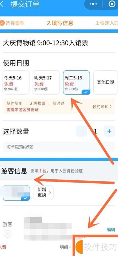6、 填写门票使用日期及游客信息后,点击提交订单完成预约,即可成功预订大庆博物馆门票,具体操作所示。