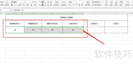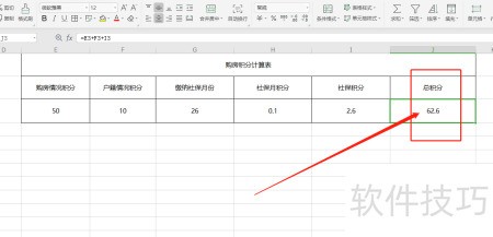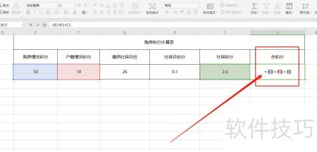 6、 第三步,按照购房积分等于购房情况、户籍情况与社保积分之和,在总积分单元格中输入=E3+F3+I3。