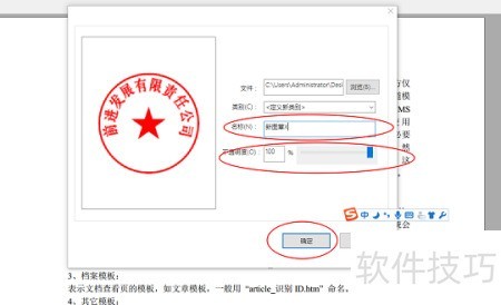 4、 选择浏览并上传公章,调整类别、名称和透明度后点击确认即可。公章可通过PS、WORD或在线工具制作。