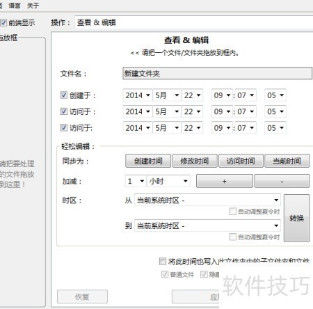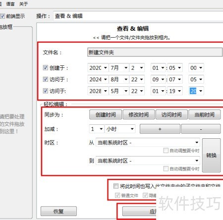 5、 调整时间戳后点击应用,可选择同步时间或增减时间进行修改。如需恢复文件(夹)的原始时间戳,点击左下角的恢复按钮即可完成操作。