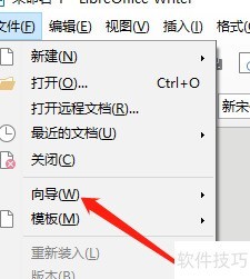 2、 打开Writer的文件菜单,选择向导中的相应选项。