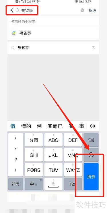 5、 在搜索框输入粤省事,然后点击搜索按钮。