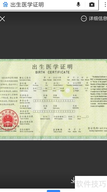 8、 准备好所需材料后,即可前往宝宝出生的医院申领出生医学证明。这是刚办理好的证明样本,供大家参考。