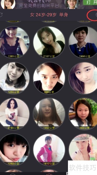 1、 打开交友软件,点击右上角的放大镜图标进行搜索。