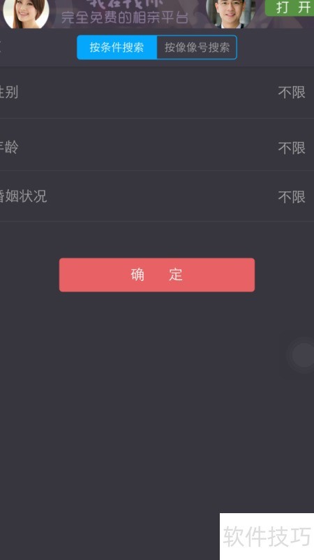 3、 搜索时可在输入框设置性别、年龄和婚姻状况等条件筛选聊友。