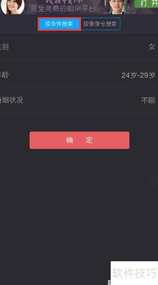 2、 像像交友软件提供两种查找方式:可根据条件筛选,也可通过像像号直接搜索用户。