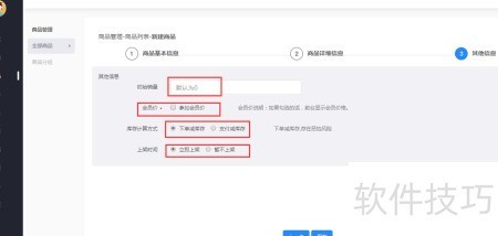 13、 最后补充商品其他信息,包括设定初始销量、会员价格、库存计算方式及上下架时间。