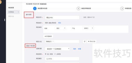 11、 输入商品名称,选定类目与分组,填写详细信息及物流资料后,点击下一步继续操作。