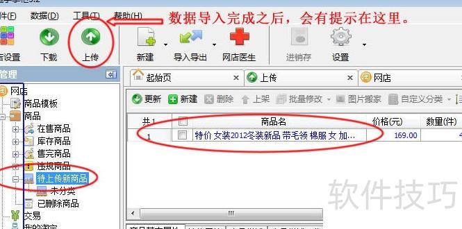 7、 导入完成后,系统会给出相应提示。依次点击左侧蓝色框内的网店、商品、待上传商品,即可找到已导入的商品。选中目标商品,对其中不完整或需调整的内容进行修改,确认无误后保存即可完成操作。