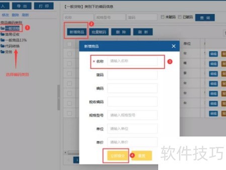 2、 选择商品编码类别,点击新增商品并填写名称,完成后点击立即提交即可保存。
