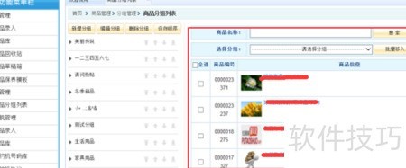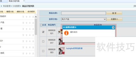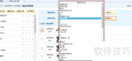 3、 在未分组商品列表中,勾选需要移动的商品,接着从列表上方的选择分组下拉菜单中选定目标分组,最后点击选择分组旁边的批量移入按钮,即可完成商品的批量移入操作。所示: