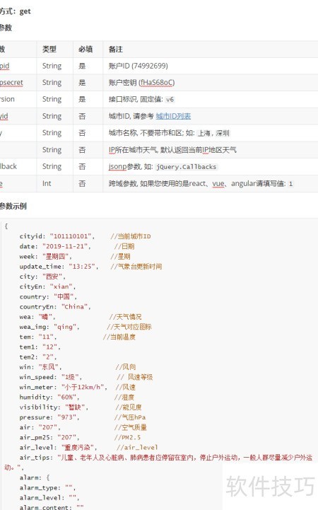 4、 返回数据通常为JSON格式,图中参数值后的注释即为对应返回参数的具体说明。
