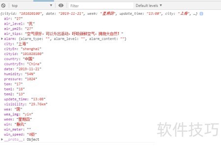9、 通过分析控制台输出的结果可知,返回内容为一个对象,只需从中提取所需属性值即可,例如使用 console.log(result.city) 获取城市信息。