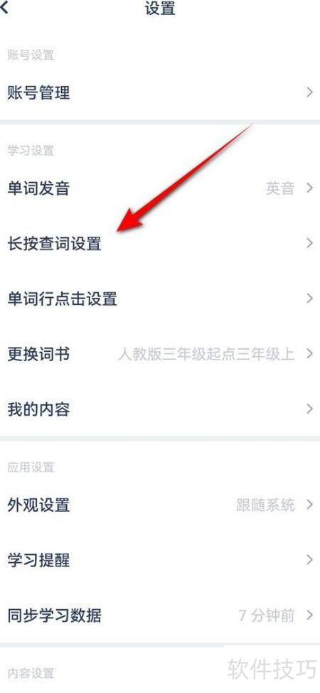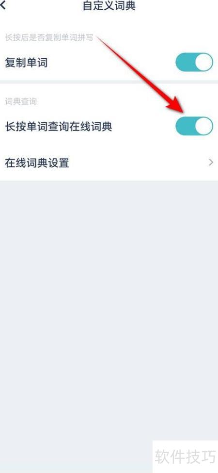 4、 开启长按单词查询在线词典功能,只需点亮旁边的小滑块,之后长按单词便可在线查词,获取更多释义信息。