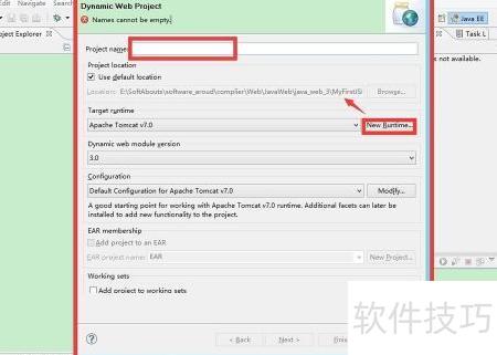 2、 在弹出的界面中输入项目名称,点击下一步。注意,New Runtime选项用于配置服务器运行环境,其功能与窗口首选项中的服务器设置相同,这意味着我们可以在创建Web项目的同时完成服务器环境的配置。