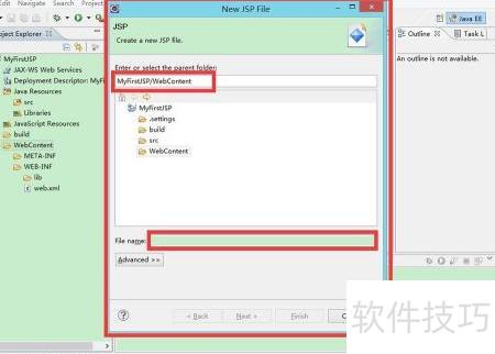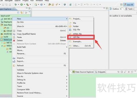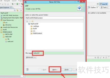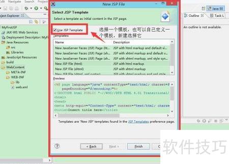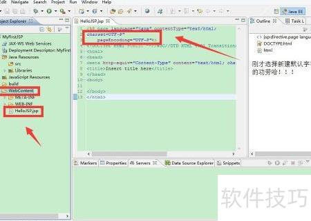 5、 接下来,根据图示创建第一个名为HelloJSP的JSP文件。通常情况下,使用默认模板即可,除非已自定义模板。创建完成后,该文件将显示在Eclipse主界面中,文件名为HelloJSP.jsp。此时可清晰看到之前设定的默认编码格式与字体大小均已生效,页面呈现效果符合初始配置,便于后续开发与调试,整个过程简洁直观,便于快速上手JSP开发。