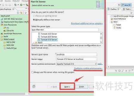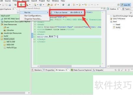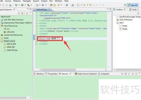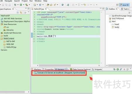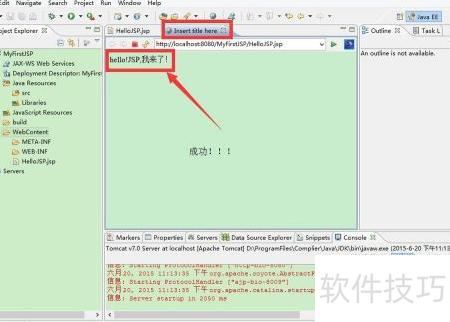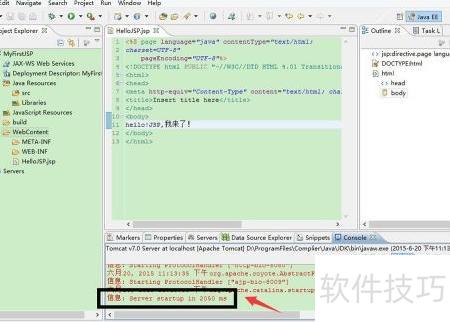 6、 在已创建的JSP文件中编写简易程序,随后启动Tomcat服务器并运行该程序。