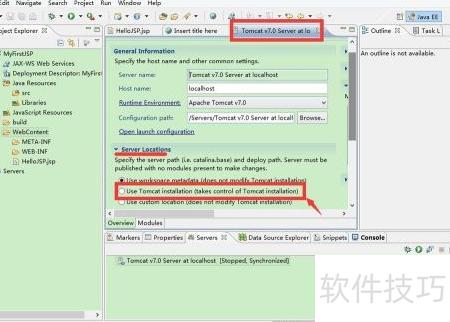 9、 配置服务器完成后,务必双击进入服务器设置界面,在Server Location选项中选择第二个Tomcat installation。若无法选中已创建的服务器,可右键点击并选择clear选项,清除当前状态后重新操作,即可顺利进行后续配置。此步骤对确保服务器正确运行至关重要,请务必按顺序执行,避免因路径或配置错误导致启动失败。