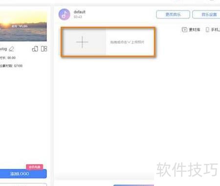 4、 点击+上传旅行照片,右侧可添加背景音乐,调节音量并裁剪片段。