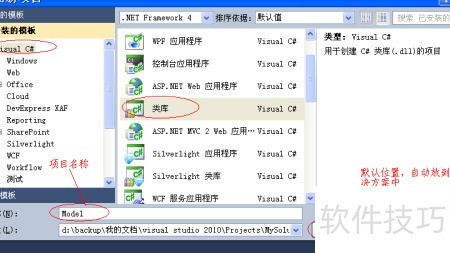 4、 在新建项目对话框中,选择Visual C下的类库模板,输入项目名称,位置保留默认路径,默认路径位于解决方案目录内,便于统一管理,确认后即可成功为解决方案添加Model项目。