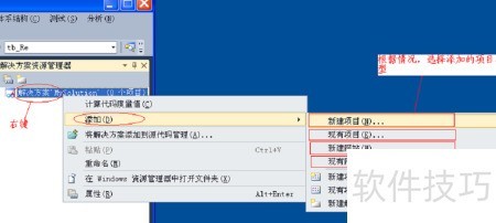 3、 在解决方案中添加新项目,可右键点击解决方案选择添加,根据需求选取相应类型;也可选中解决方案,通过菜单栏文件→添加完成项目添加操作。