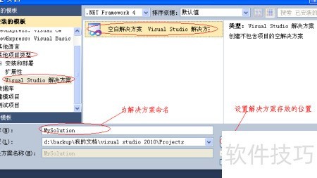 2、 在新建项目对话框中,选择其他项目类型下的Visual Studio 解决方案,输入解决方案名称,指定保存路径,然后点击确定按钮,即可成功创建一个空的解决方案。