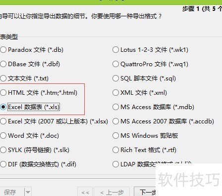 16、 在导出向导界面,需先选择导出格式:若导出为Excel,可选*.xls或*.xlsx;若导出为网页,则选*.html。选定格式后,点击下一步继续操作。