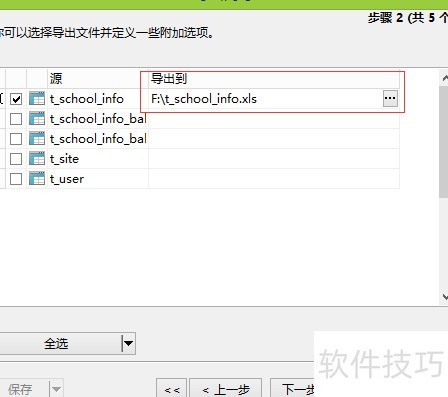 17、 在该页面勾选需导出的表,选择目标目录,确认后点击下一步即可完成导出设置。