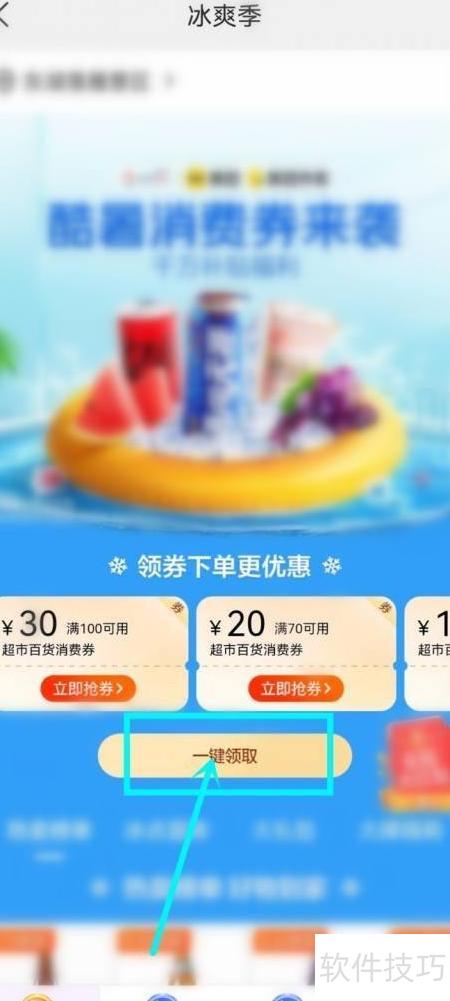 4、 进入活动页面,点击一键领取即可获得超市百货消费券。