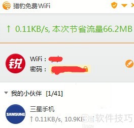 3、 将电脑和手机连接至同一网络,可通过路由器实现,也可由电脑创建热点供手机连接。我使用金山软件开启WiFi热点,三星手机直接连入电脑共享的无线网络。