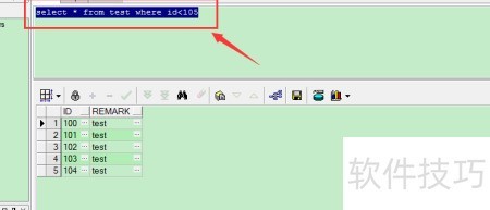 2、 查询测试表中id小于105的记录,结果显示仅有5条符合条件的数据。