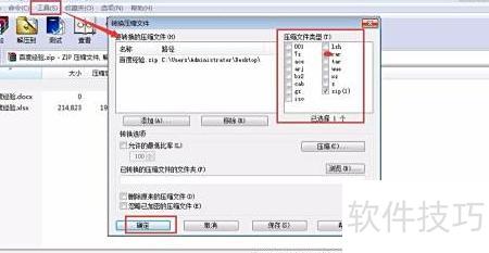 4、 选择工具中的转换压缩格式功能,弹出对话框后,在右侧选中rar格式,确认操作,系统将立即生成一个新的压缩文件。