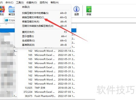 1、 启动WinRAR,进入工具菜单选择转换压缩文件格式。