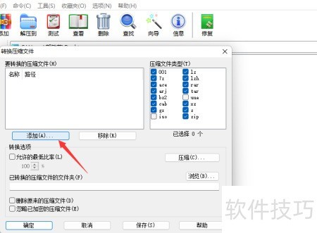 2、 在弹出菜单中点击添加,批量选中需转换的RAR文件。